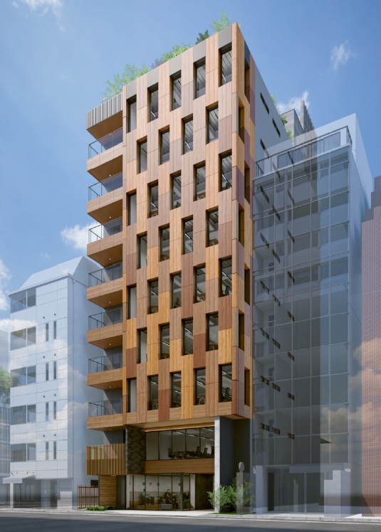 働く人や来館者を温かく迎えてくれる木調のファサードのなかには、シェアラウンジ、ルーフテラス、オールジェンダートイレなどの共用設備が充実。「ZEB Ready」認証の取得や外装の一部に東京・多摩地区産の木材を使用するなど環境にも配慮しています。